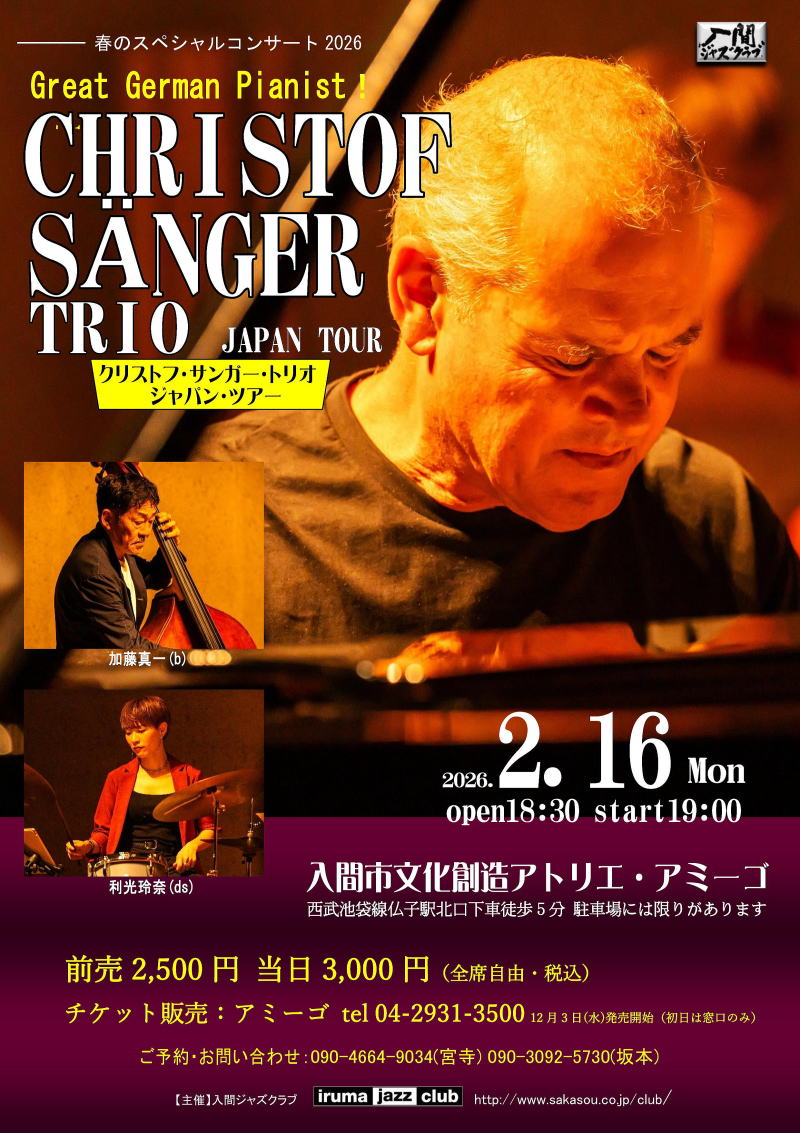 | 2023年4月のジャパン・ツアーでのライブ盤「クリストフ・サンガー・トリオ・アット・イルマジャズクラブ」がドイツ“ライカレーベル”からリリースされ、今後「青サンガ―」としてファンの間で定着しそうな予感がする傑作、と評価されています。今回再び入間でコンサートを開催いたします。クリストフにとって8回目のジャパンツアー、入間ジャズクラブでは6回目の開催となります。グレート・ジャーマン・ピアニストの雄姿をお見逃しなく! |